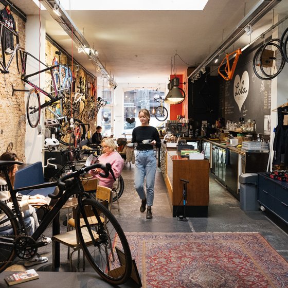 Bei Lola darf man sein Rad mit ins Café hineinnehmen und dort parken. Und es bei Bedarf vom Personal reparieren oder warten lassen, während man Kaffee trinkt und ein Stück Kuchen genießt. Doch Lola ist noch viel mehr: Hier trifft sich auch der Lola Cycling Club, eine Truppe begeisterter Radler*innen, die gemeinsam auf Radtouren geht. „Von Teenagern bis zu 70-Jährigen sind alle dabei“, sagt Mitgründer und Manager Eric Schulte.